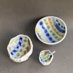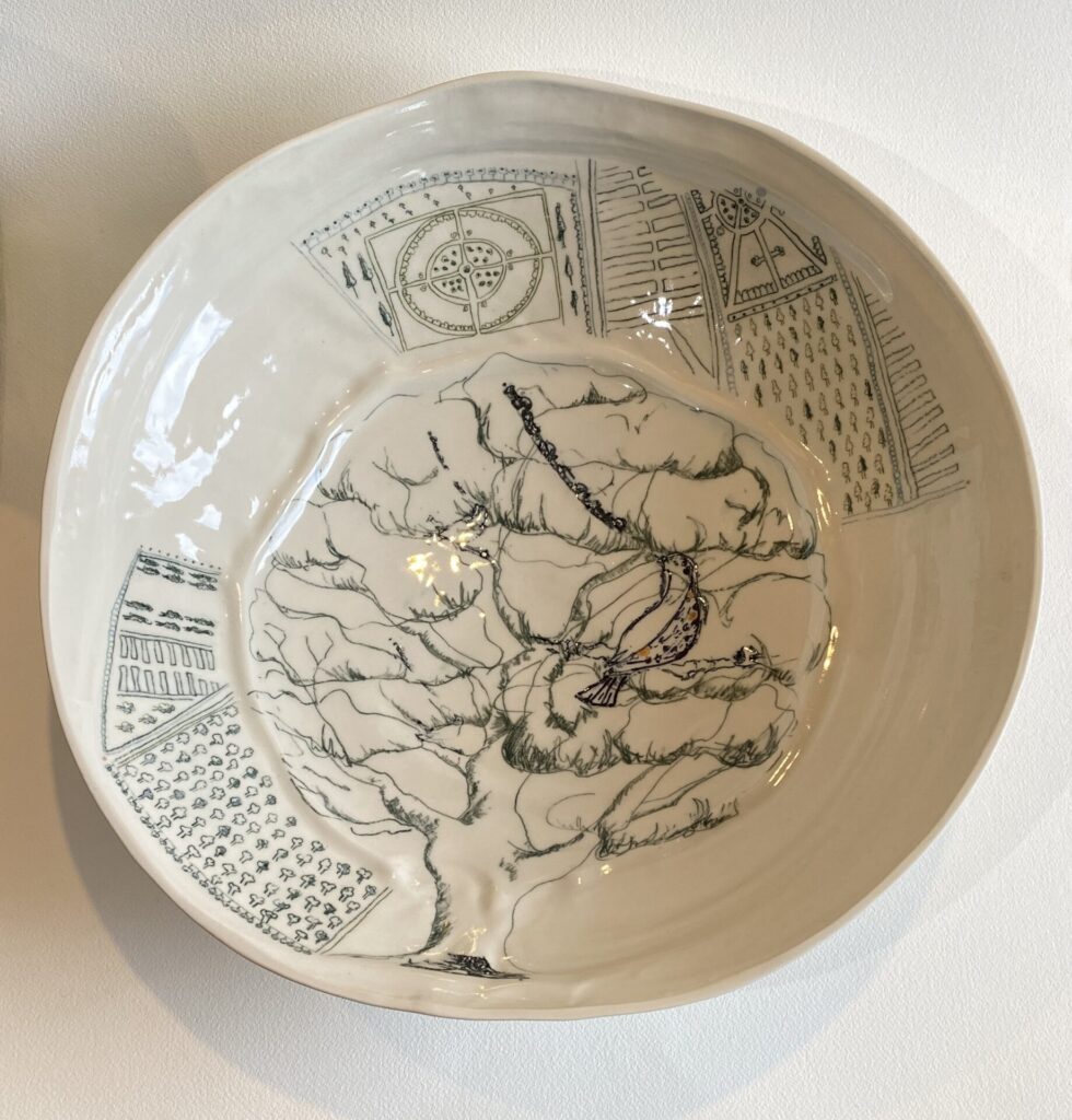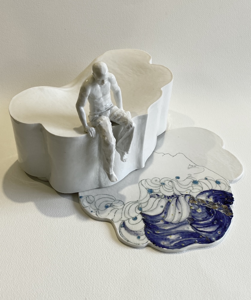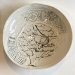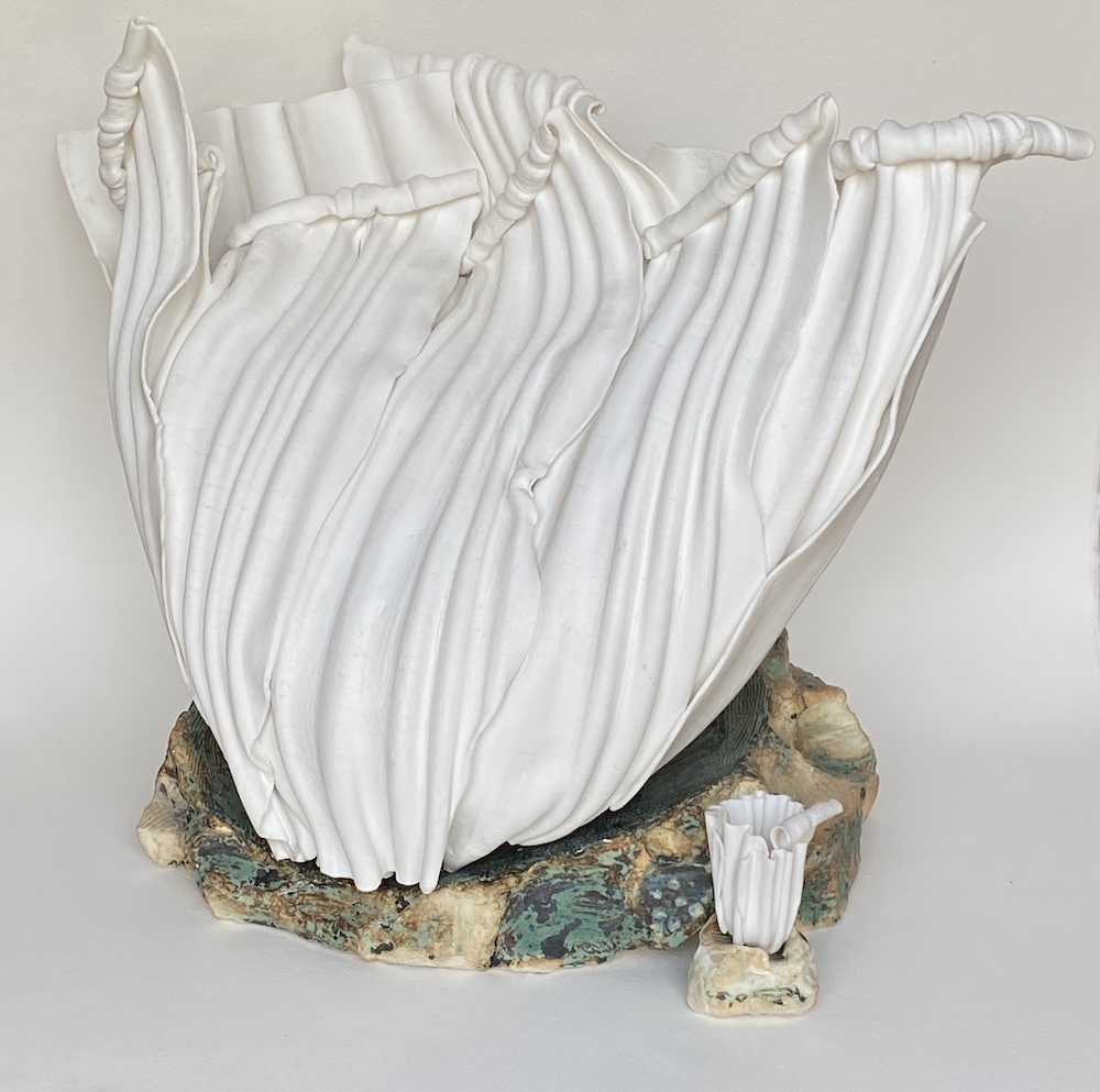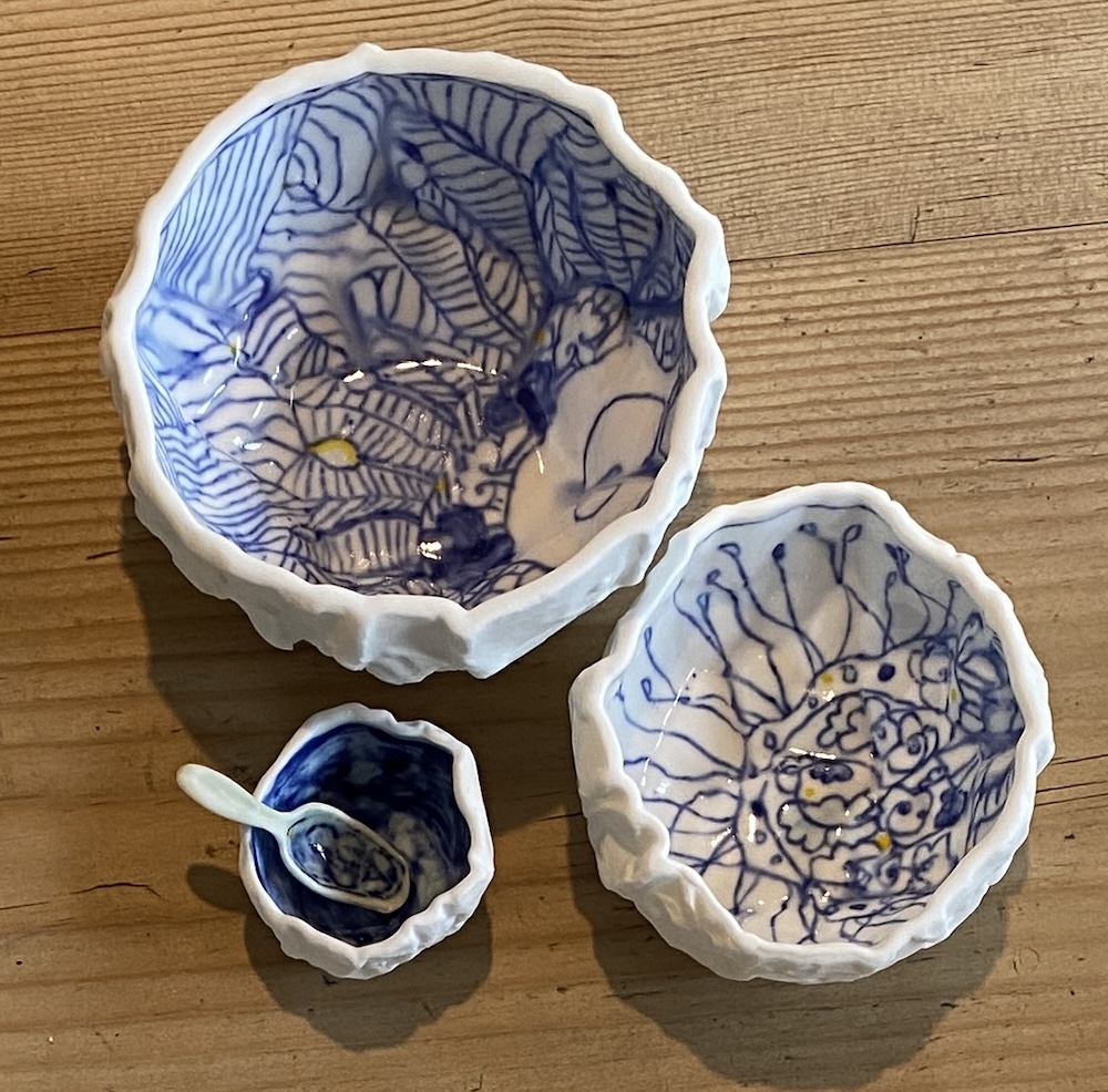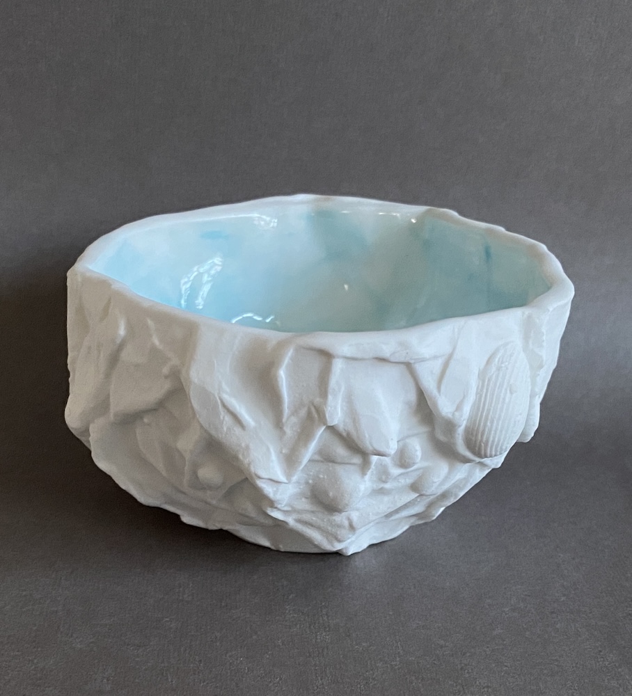 I am a ceramic artist who loves to work to a theme, creating individual and often narrative pieces of work. Ideas are inspired by natural form, landscape and seascape, music and music notation. Much of my work begins its journey in the liquid form of porcelain and bone china clays, known as casting slip. Sculptural elements are handbuilt using clays reinforced with flax or grog. I enjoy building up pattern with drawn elements, mark making and exploring colour. My ceramic studies culminated in Professional Development Diploma Fine Art Ceramics in 2004.