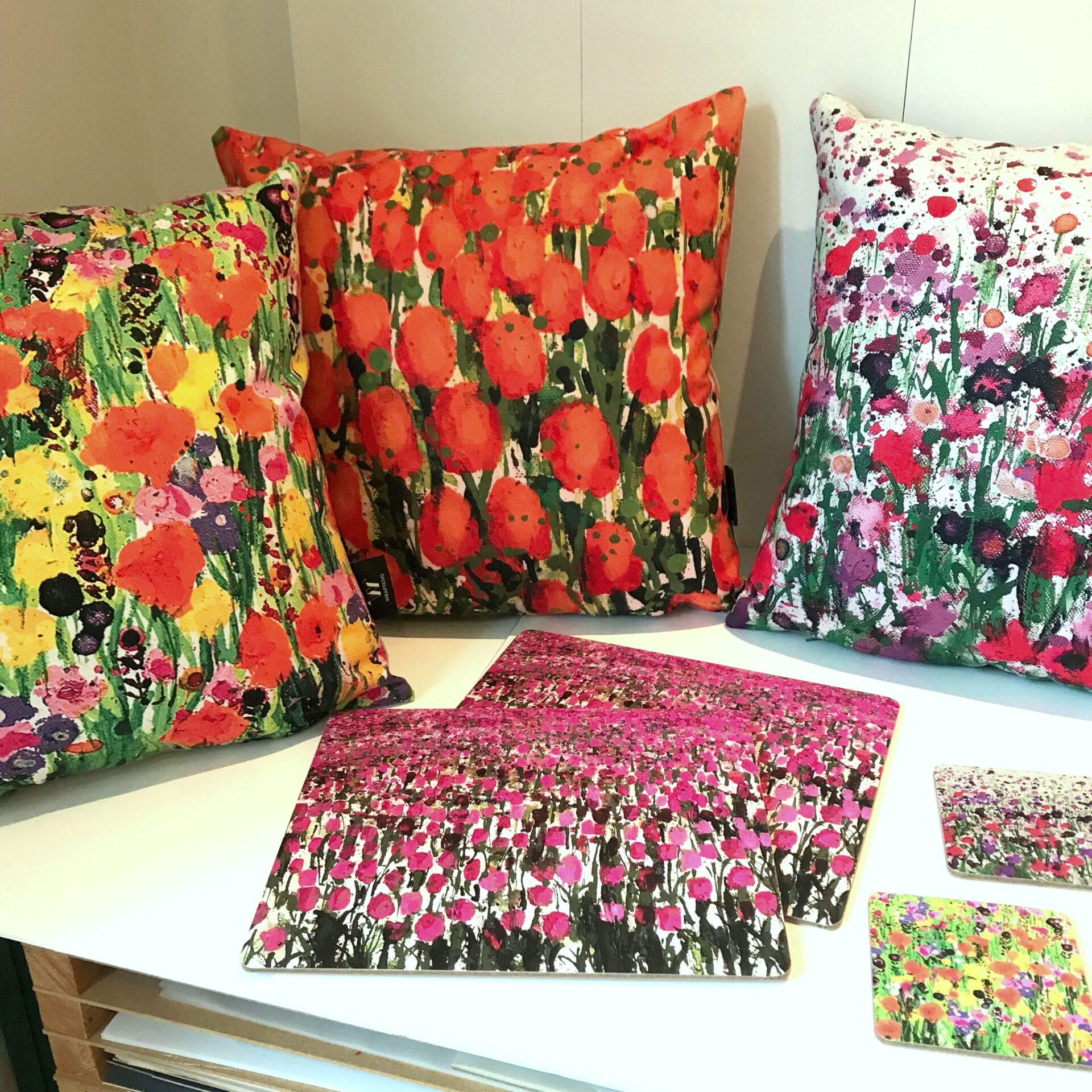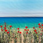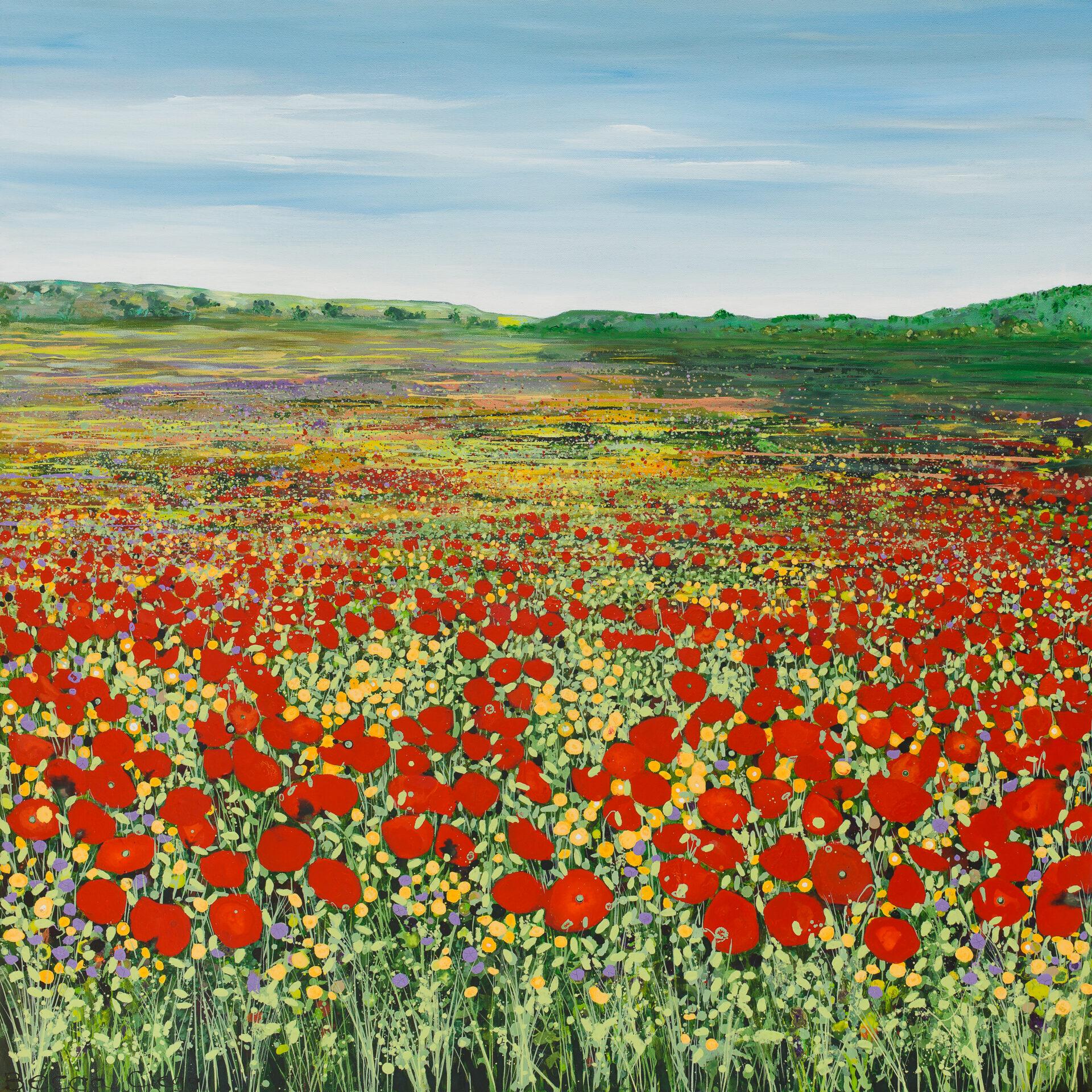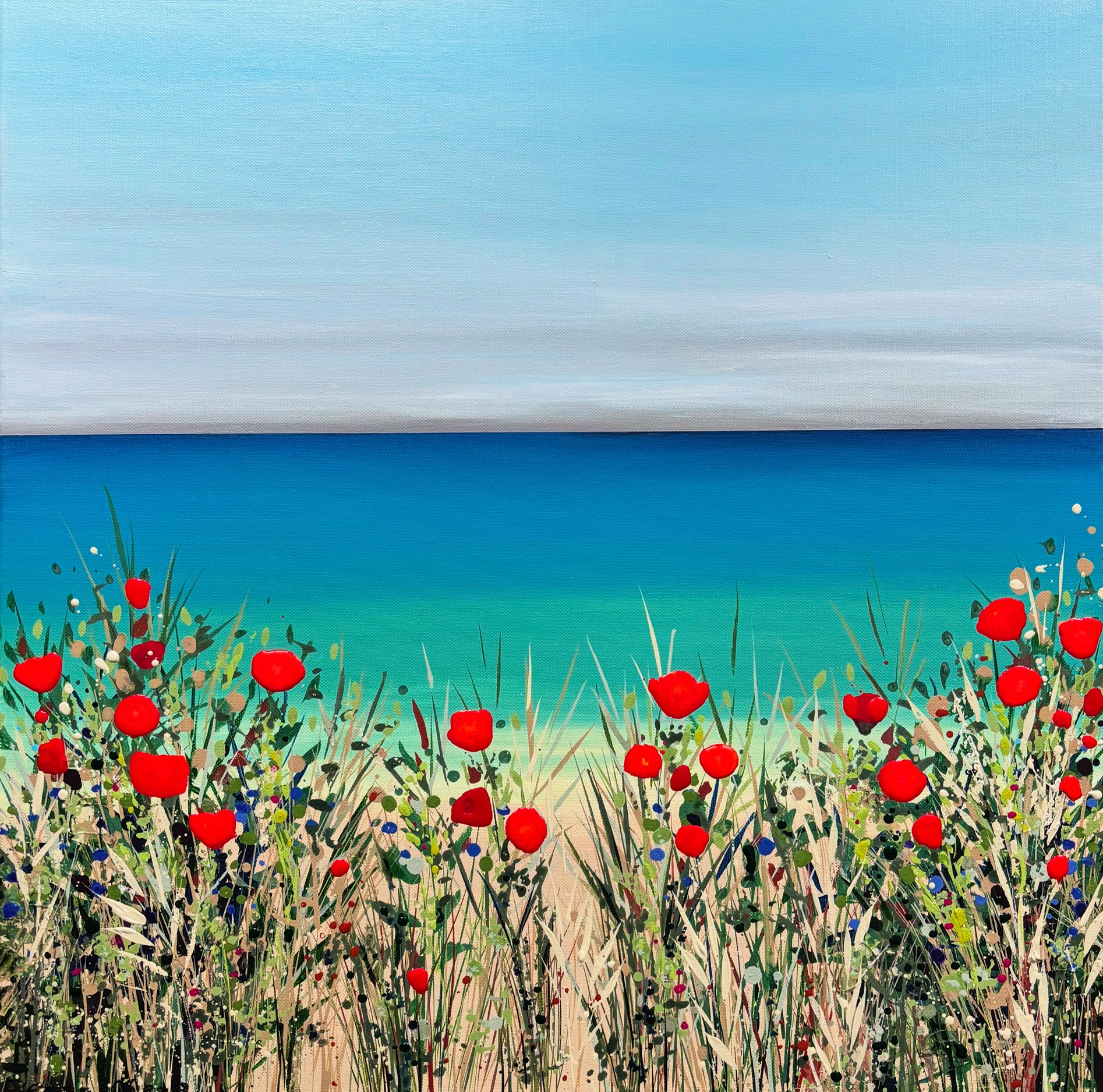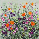 Paintings are colourful and joyful; often inspired by a swathe of flowers which look like brushstruokes in the landscape: or beautiful coast with wildflowers.