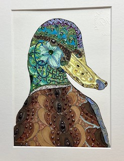 Deborah Waters is a self-taught artist who has developed a technique of intricately drawn patterns, creating texture and contrast to her sketches using pen and alcohol-based ink. She embellishes each piece with high quality colour matched rhinestones for her trademark sparkle. Deborah’s work does not photograph well, it needs to be seen live to appreciate the sparkle and vibrancy. Deborah trades under the name “Desirables by Deborah” and has an online portfolio on Facebook and Instagram.