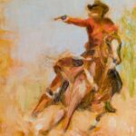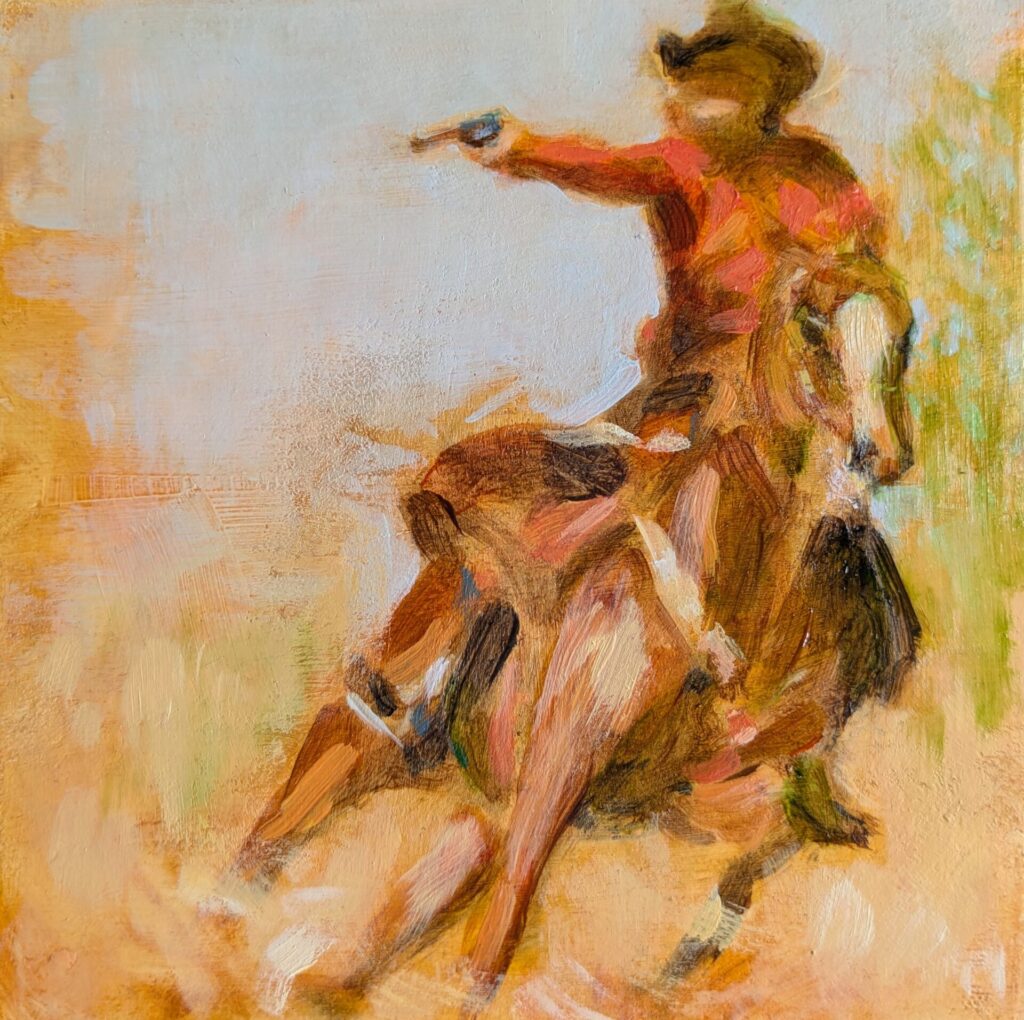 My work explores the interplay of memory, imagination and narrative, drawing inspiration from the rich visual language of childhood picture books, stories, classic Western films, and cultural archetypes. The Western Series is a mixed-media exploration of these themes, combining prints, collages and paintings that re-imagine iconic imagery of Cowboys and Native Americans through the lens of nostalgia and creative reinterpretation. This series extends into small oil landscapes that capture fleeting weather phenomena, evoking the untamed spirit of the West.