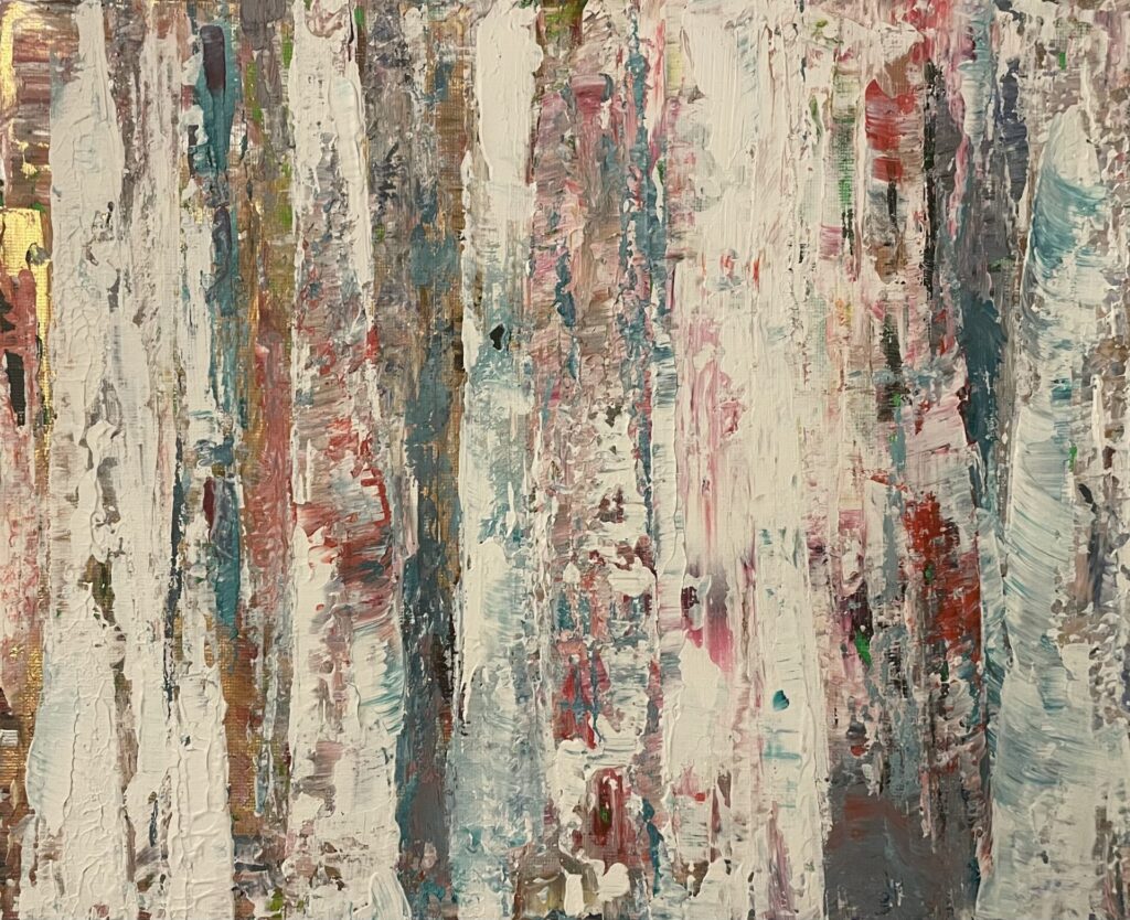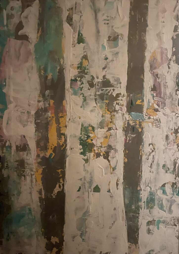 My background in the fashion and beauty industry, specialising in perfumery and communication, deepened my appreciation of how powerfully the five senses shape our experience of the world. Now, instead of capturing an essence in a bottle, I aim to capture the feeling of a moment in paint. My abstract and semi-abstract pieces reimagine familiar forms — such as tree trunks and natural textures — through unexpected colours, contrasts, and layered surfaces.