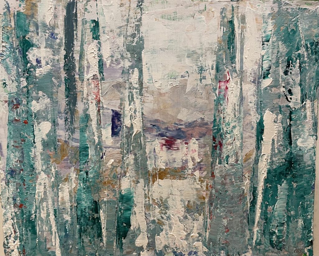 I love letter writing and calligraphy, and sometimes weave words into my pieces, because dialogue matters. A painting isn’t finished when I put down the palette knife — it comes alive through the thoughts, feelings, and interpretations we bring to it.