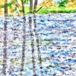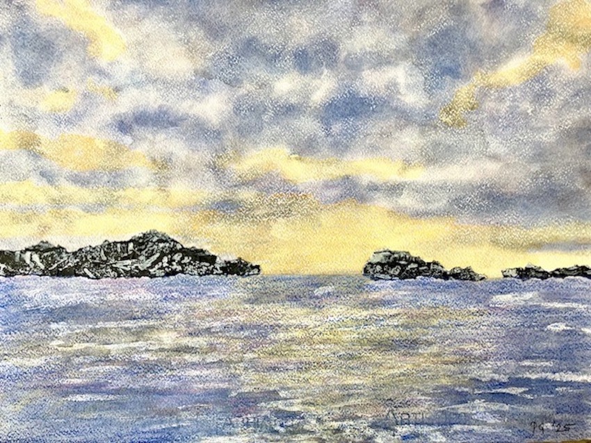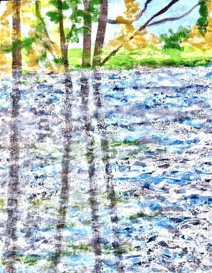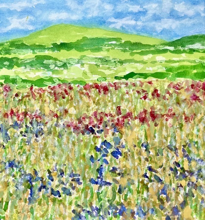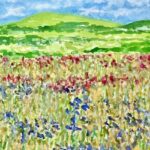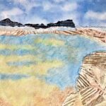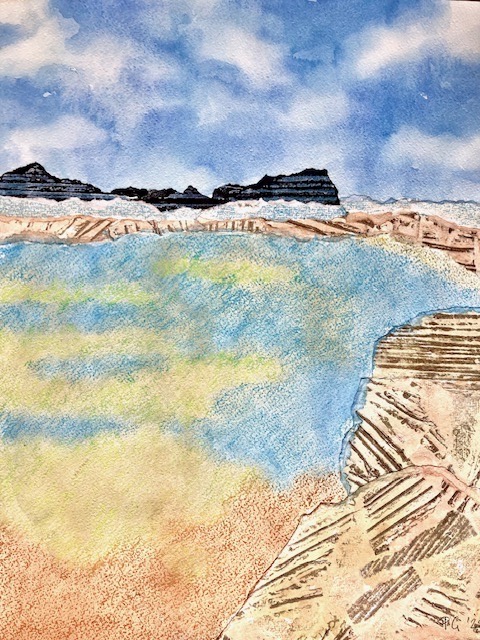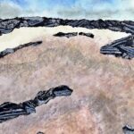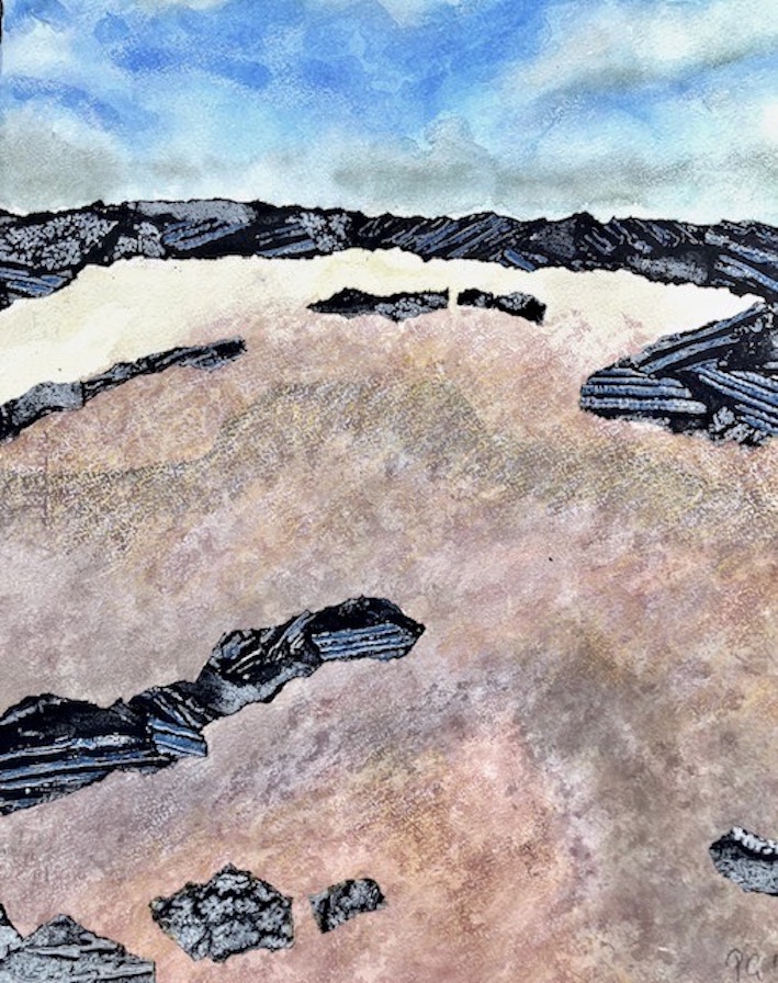 In my paintings and mixed media works on paper, I explore the colours, textures and rhythms of familiar landscapes near to my home and very different landscapes experienced on my travels. In each painting, I try to capture a moment in time and constant change due to weather, the seasons and human intervention.