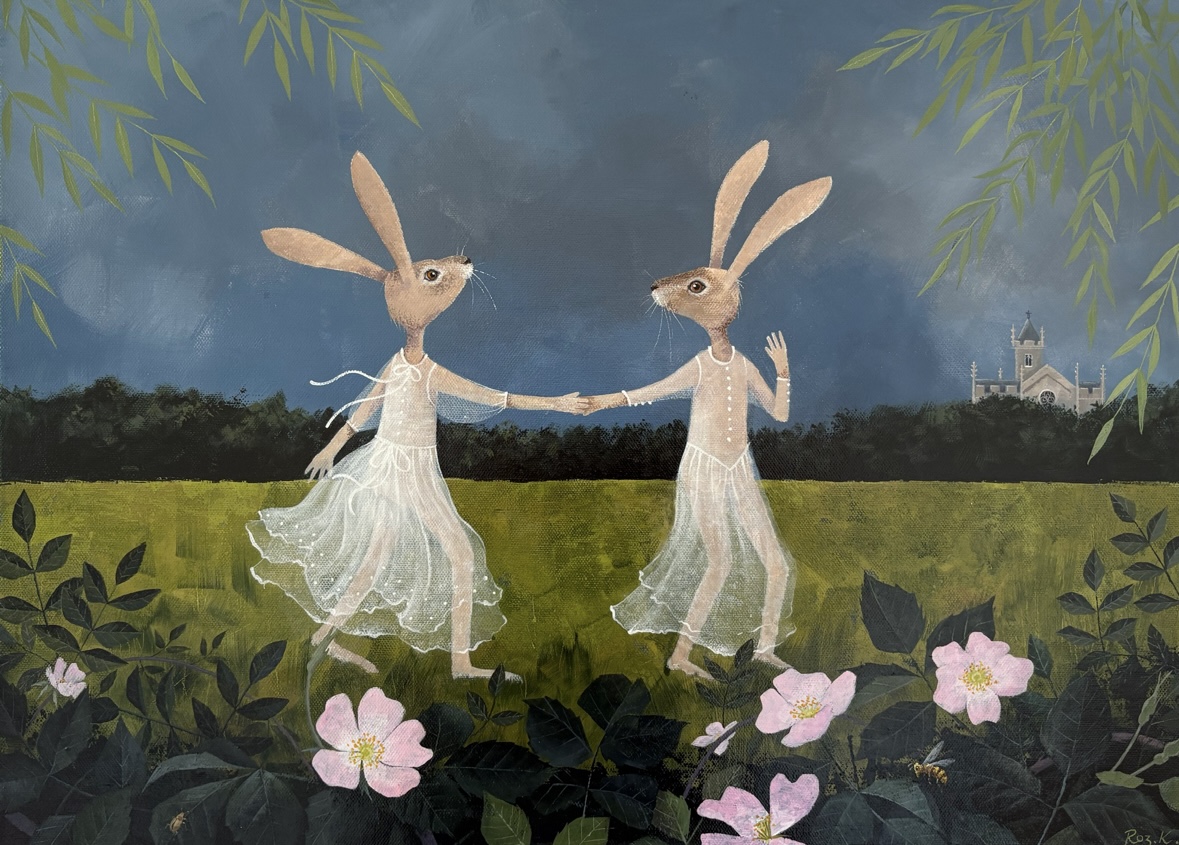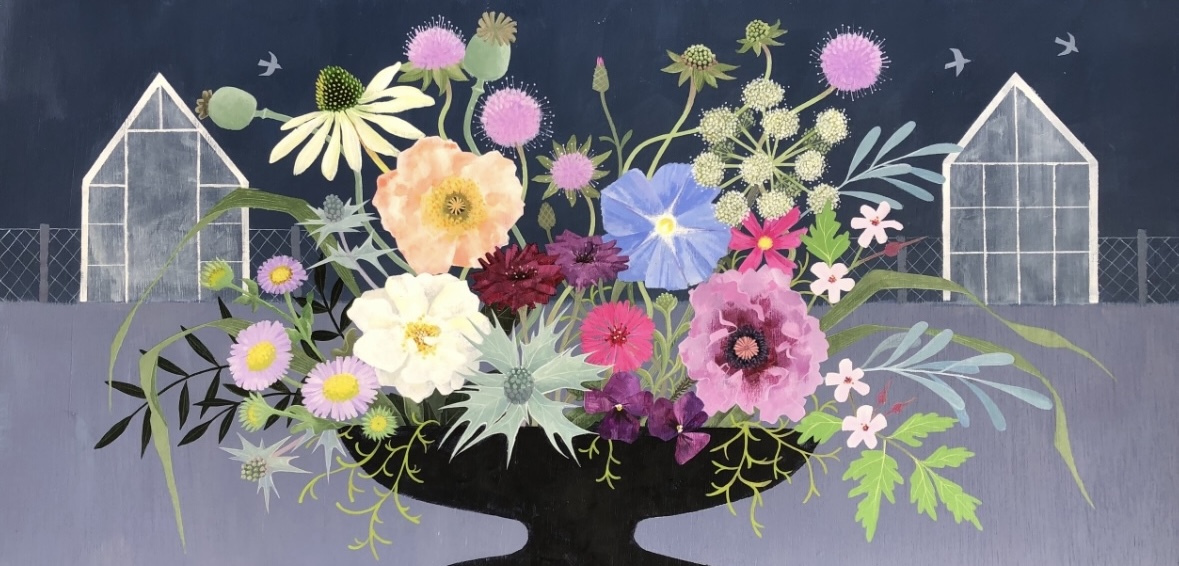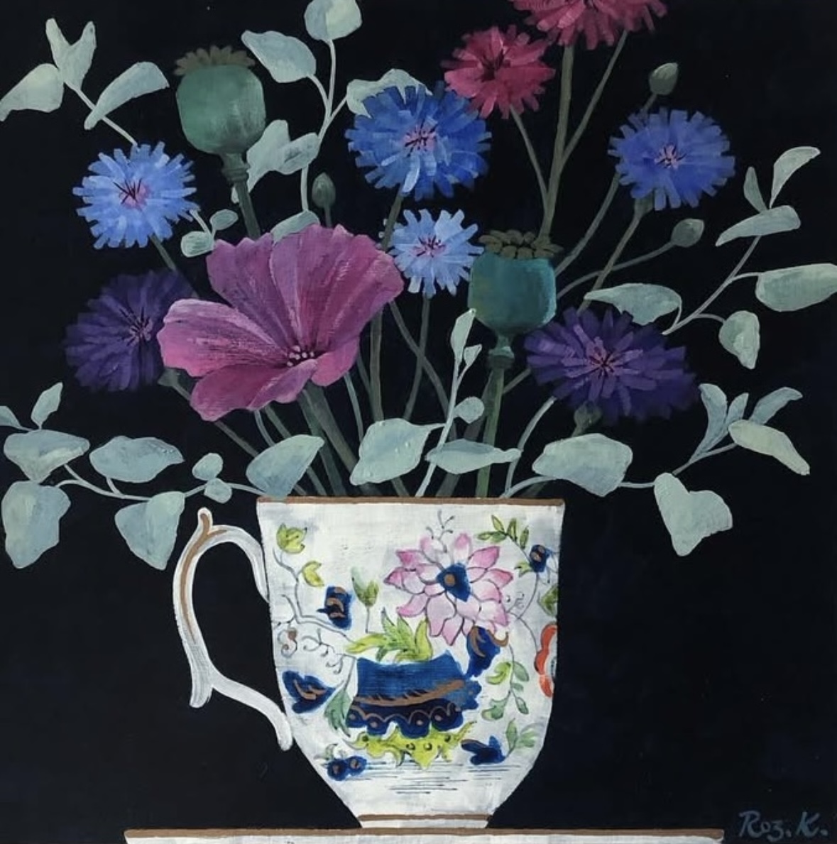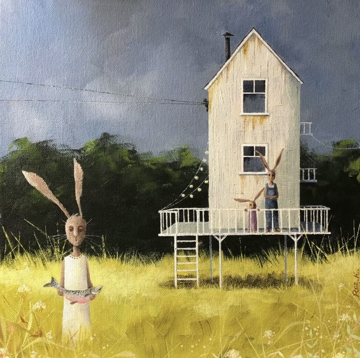 Rosalinda has a background in children’s book illustration, but now works as a painter from her studio in Guildford. Her colourful paintings depict flowers and plants spotted whilst out walking and often displayed in the vintage ceramics she likes to collect. Sometimes a particular landscape will inspire one of her gently surreal landscape paintings, where rabbits exist in semi-human form.