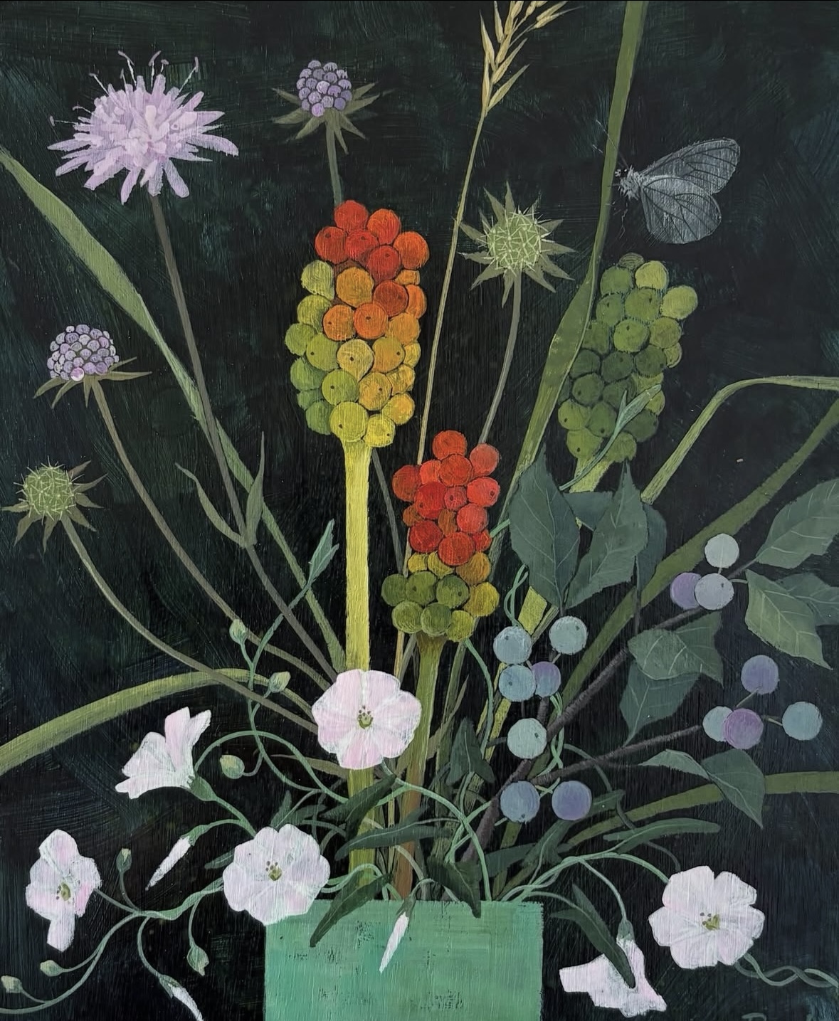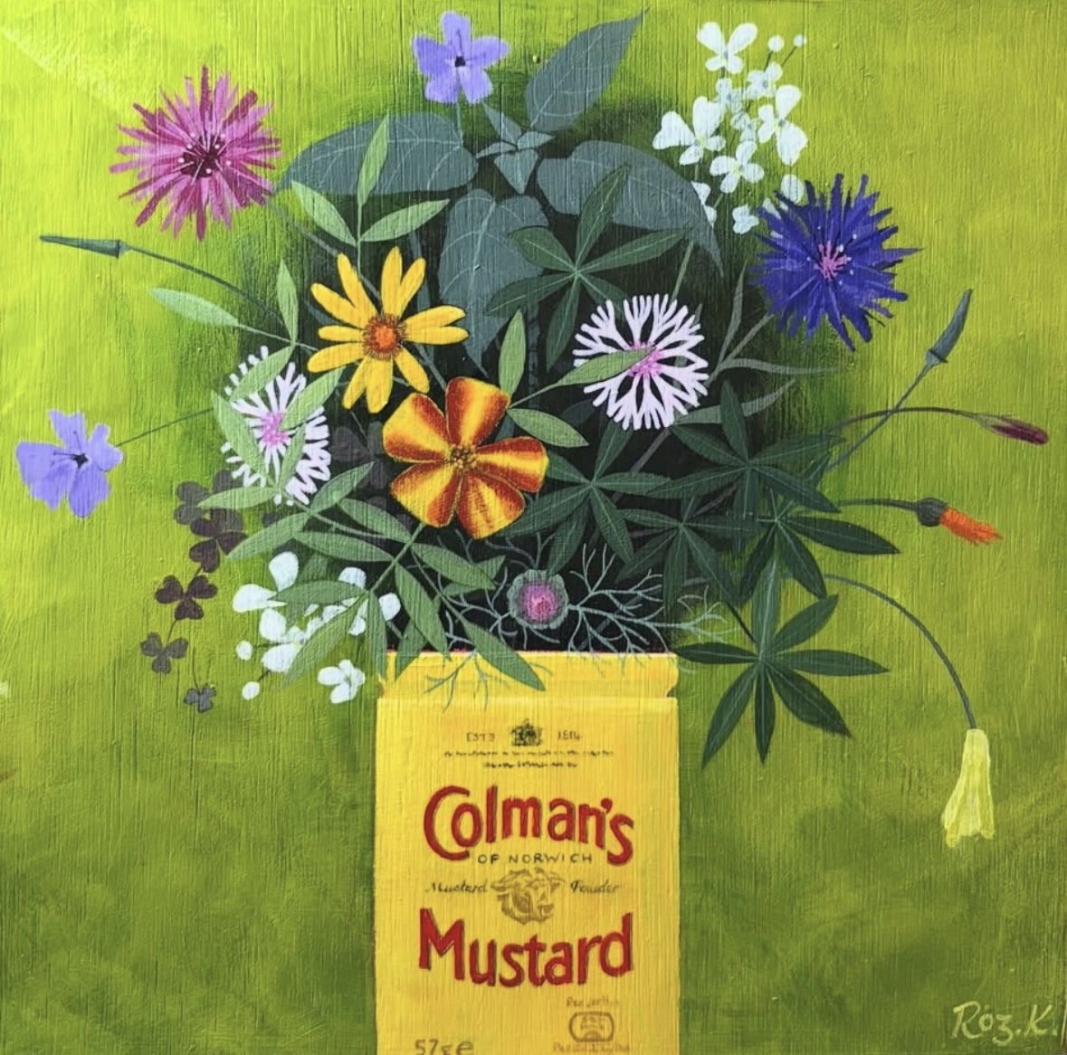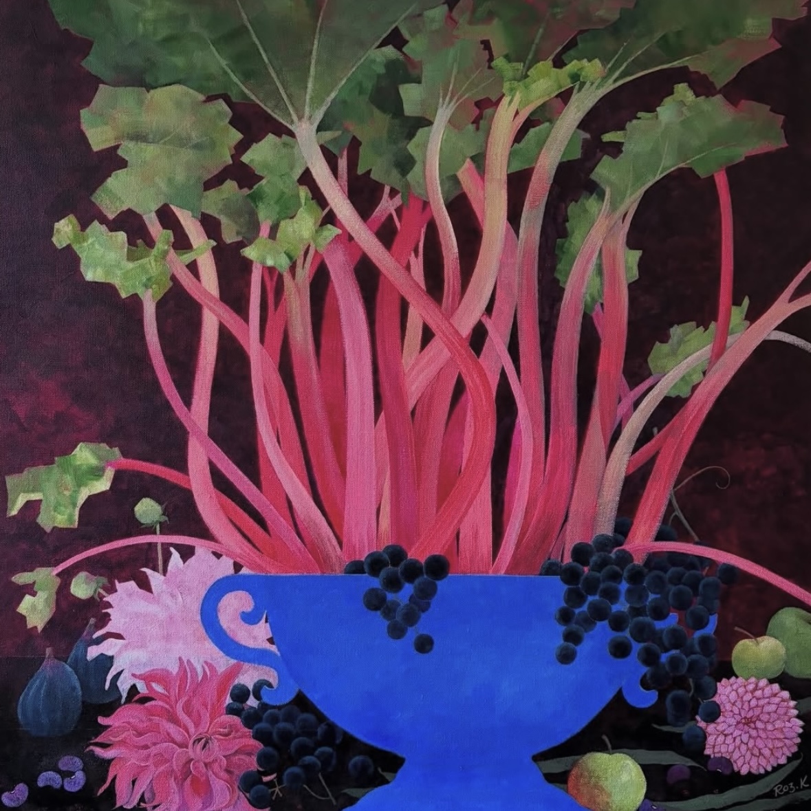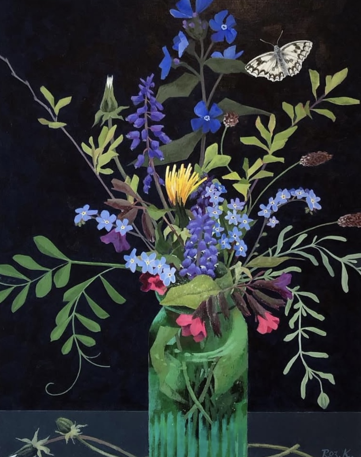 Rosalinda has a background in children’s book illustration, but now works as a painter from her studio in Guildford. Her colourful paintings depict flowers and plants spotted whilst out walking and often displayed in the vintage ceramics she likes to collect. Sometimes a particular landscape will inspire one of her gently surreal landscape paintings, where rabbits exist in semi-human form.
