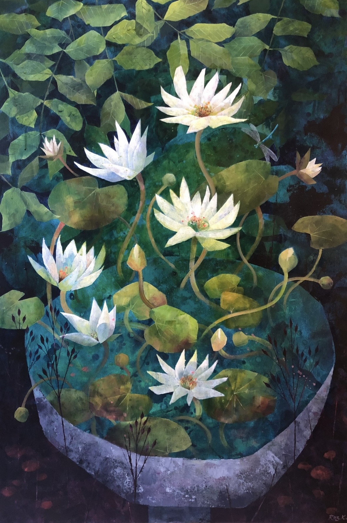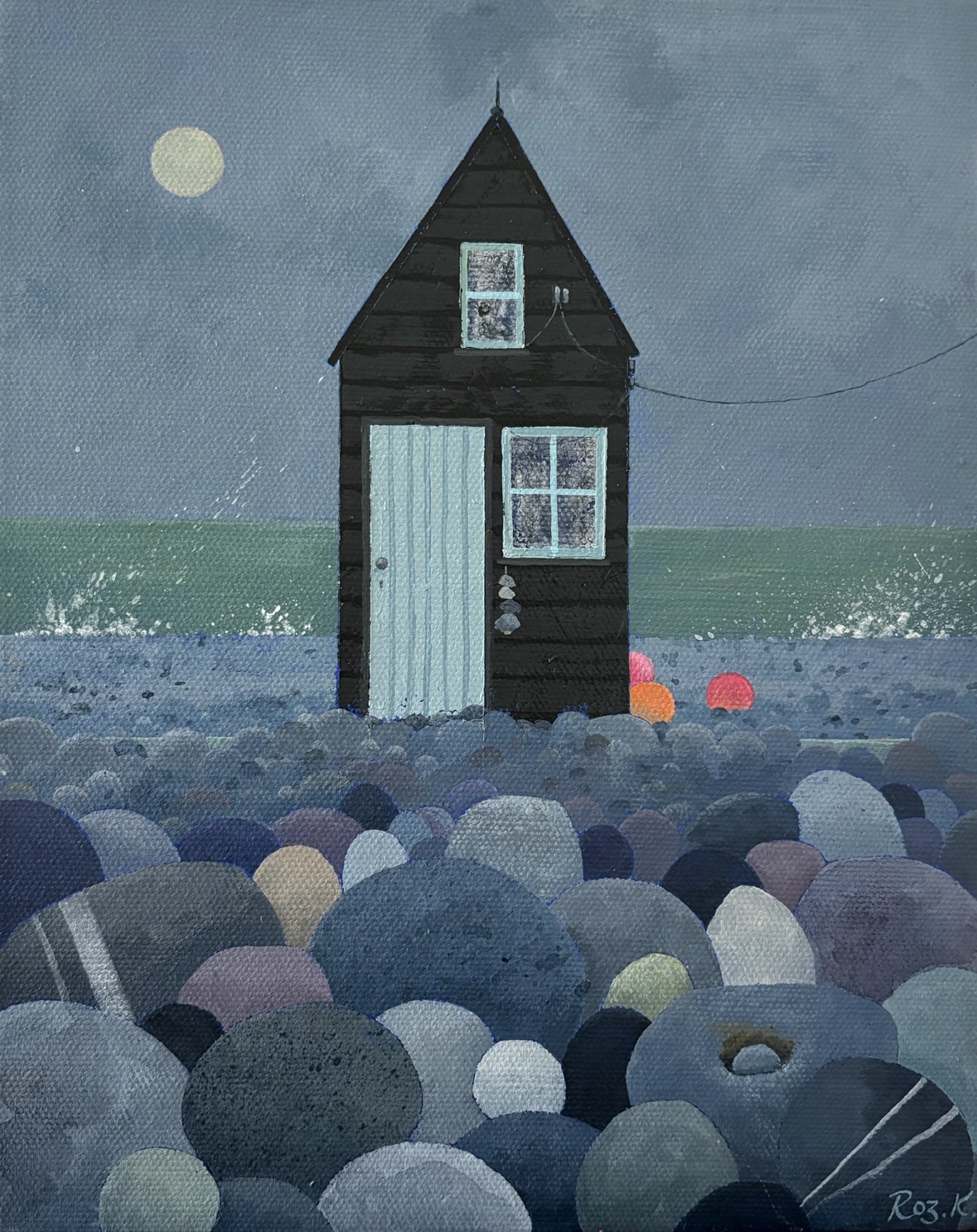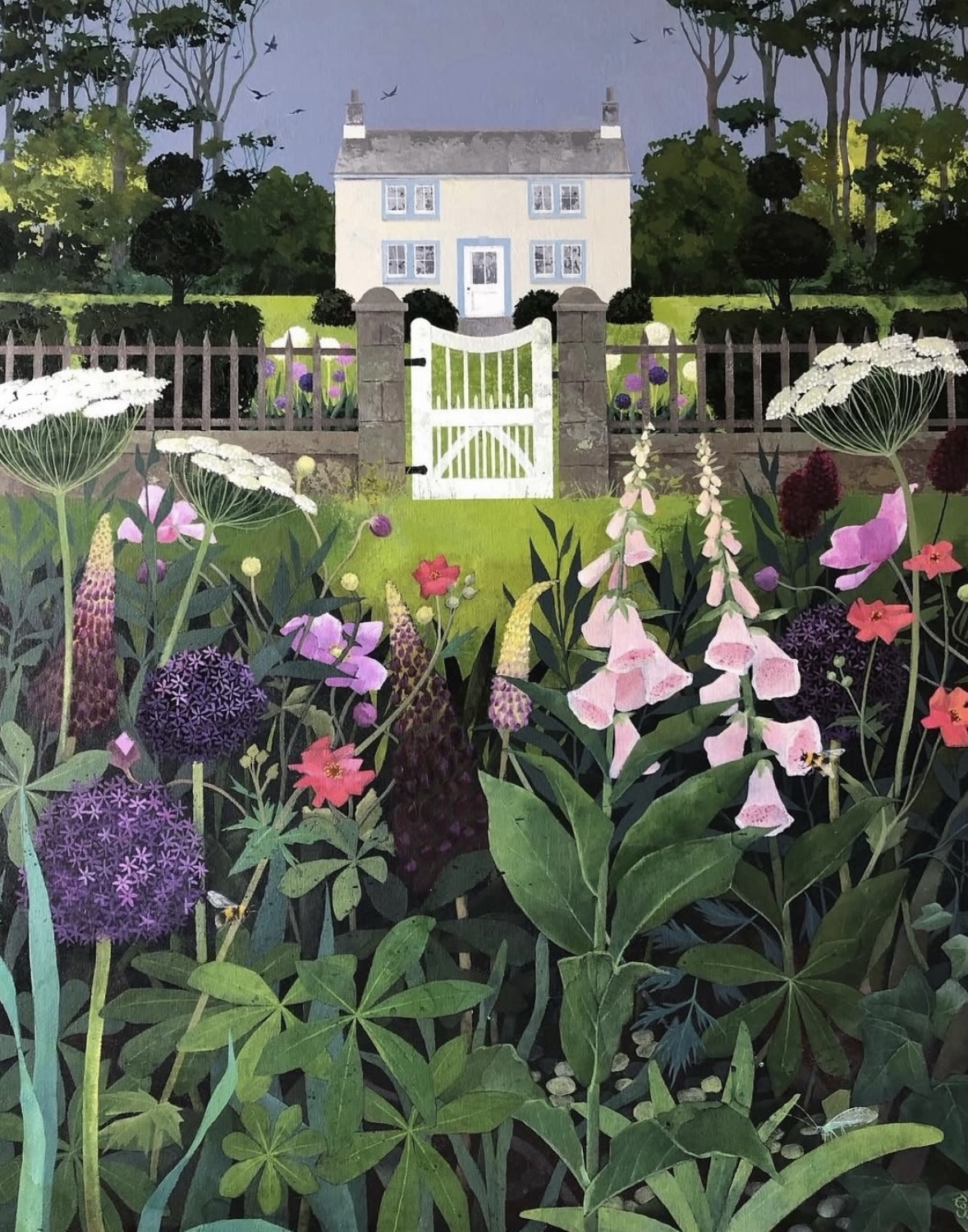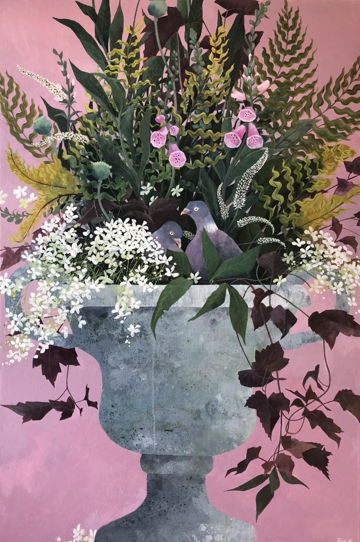 Rosalinda has a background in children’s book illustration, but now works as a painter from her studio in Guildford. Her colourful paintings depict flowers and plants spotted whilst out walking and often displayed in the vintage ceramics she likes to collect. Sometimes a particular landscape will inspire one of her gently surreal landscape paintings, where rabbits exist in semi-human form.